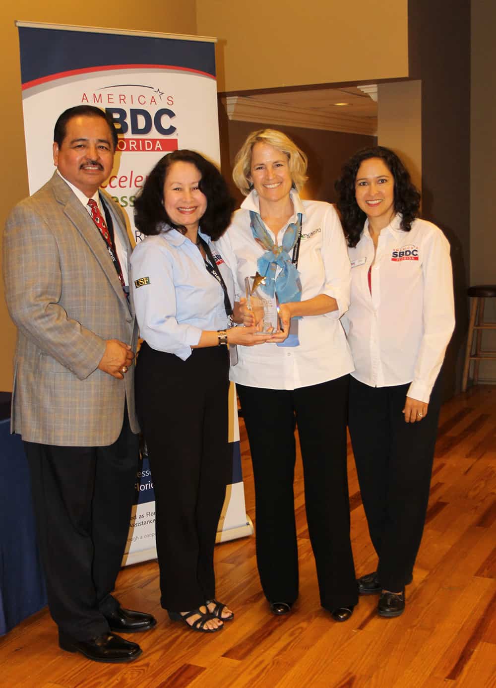 Pictured: Robert Chavarria, Small Business Administration Senior Area Manager, Eileen Rodriguez, Regional Director Florida SBDC at USF, Amy Diehl, President AwnClean, USA, Yanina Rosario, Associate Director Florida SBDC at USF (Judith Turner, e-construction group, Inc. could not be present for the ceremony.)