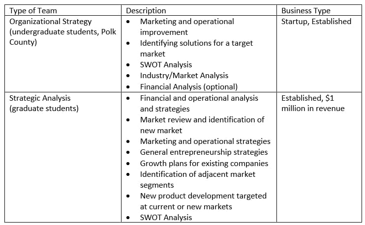 This program lasts one semester, up to 14 weeks. During the semester, the student team will prepare an individualized product, based on the business’ needs and selected team. A written report will be created providing the organization with a professional, fully developed plan for use in guiding and developing the business. Products available include the following: