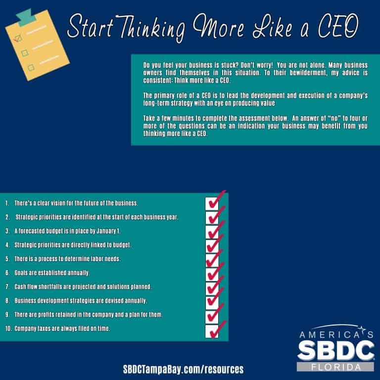 Take a few minutes to complete the assessment below. An answer of “no” to four or more of the questions can be an indication your business may benefit from you thinking more like a CEO.